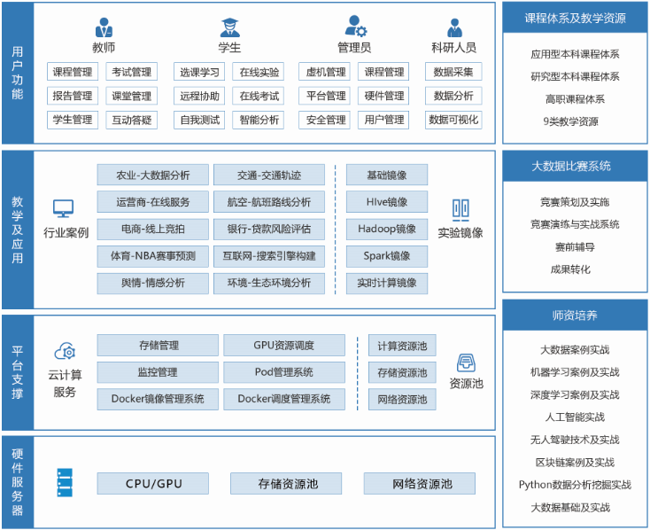 普開數(shù)據(jù)針高校進(jìn)行了大數(shù)據(jù)教學(xué)管理、項目實(shí)踐、科研服務(wù)、創(chuàng)新孵化等實(shí)際應(yīng)用場景,大數(shù)據(jù)實(shí)驗(yàn)室提供穩(wěn)定、可靠、高效的軟硬一體化大數(shù)據(jù)教學(xué)科研環(huán)境,以及完善的課程體系、項目數(shù)據(jù)和視頻、多樣化的教學(xué)手段和豐富的實(shí)戰(zhàn)案例。